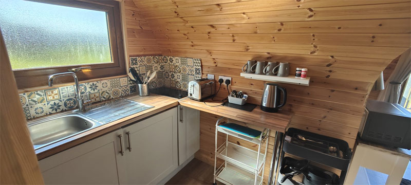Kitchen area: Electric oven, electric hob, microwave, fridge